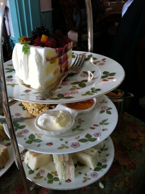 テーブルが狭かったのでアフタヌーンティーセットの三段タワーはひとつしか置けなかったのですが、上からケーキ、スコーン、プチサンドイッチとなっております!