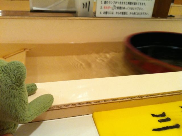 で、その食券を座った席にある板に付けて空の桶に入れて流します。