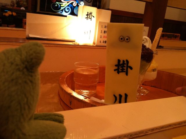 流れ着いたよ掛川!お冷と抹茶パフェとパインソフト!